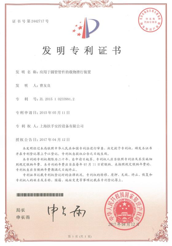 [资质荣誉] 发明专利证书-圆管管件的载物滑行装置 日期:2019-03-22 14:32:24 点击:195 好评:0