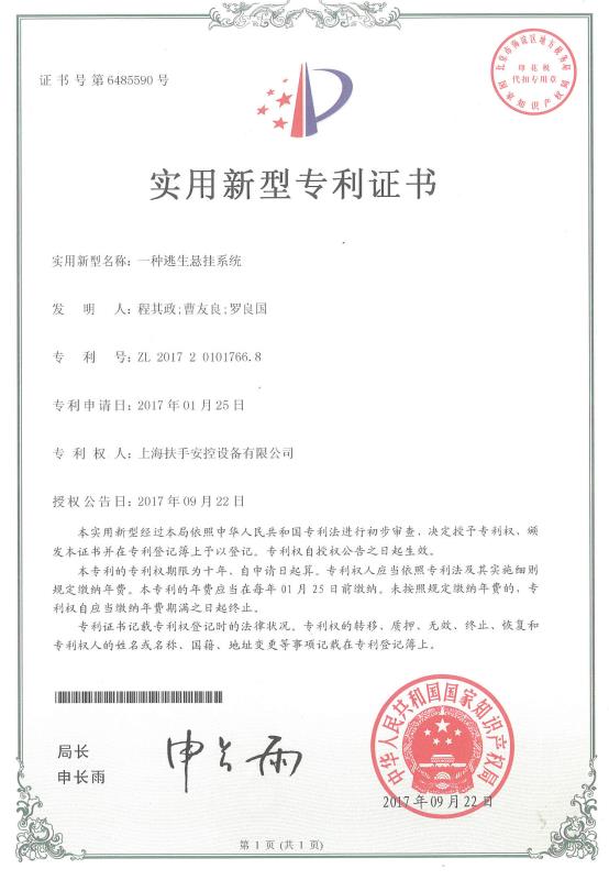[资质荣誉] 实用新型专利证书-逃生悬挂系统 日期:2019-03-22 14:31:05 点击:163 好评:0