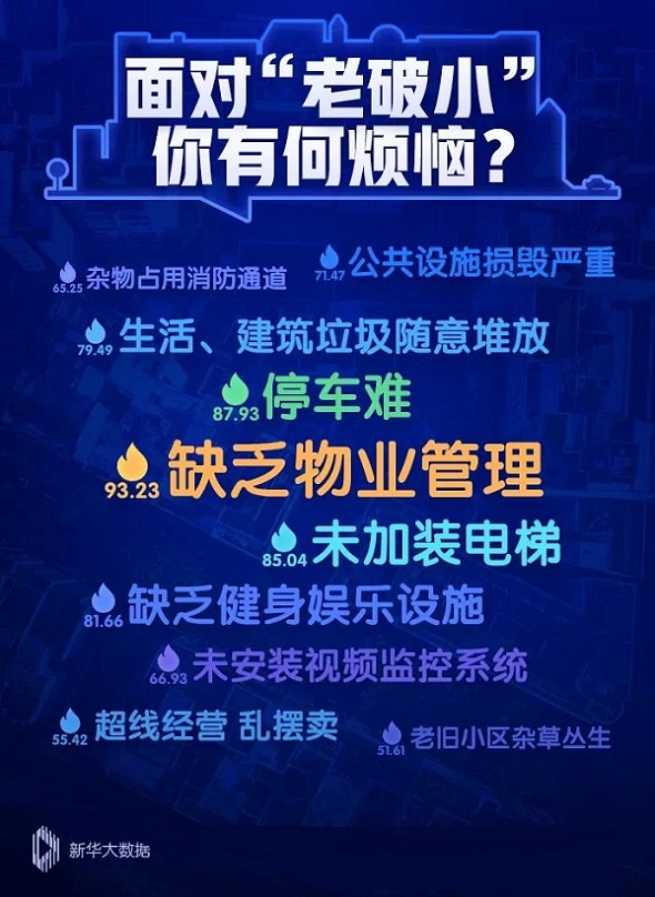 新华大数据显示,与“老破小”相关的话题中,“缺乏物业管理”、“停车难”“未加装电梯”等问题被提及次数最多,话题热度分别达93.23、87.93和85.04。