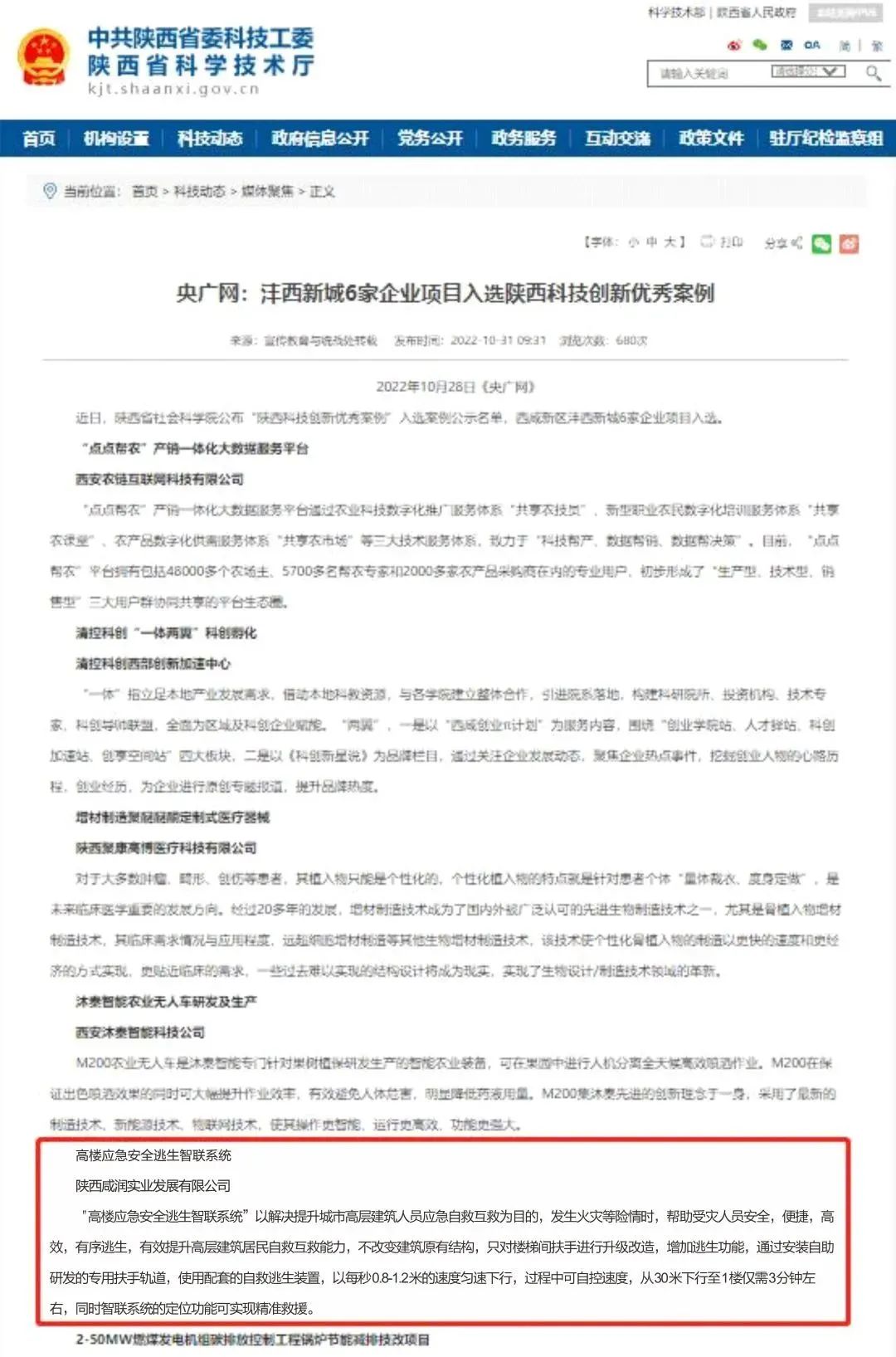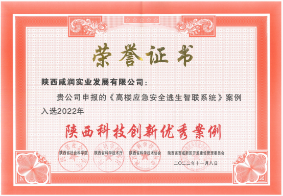 我司自主研发的专利型科技项目“高楼应急安全逃生智联系统”作为“创新赋能高效治理高品质生活”板块成功入选2022年陕西科技创新优秀案例。据了解,沣西新城共有6家企业项目入选。