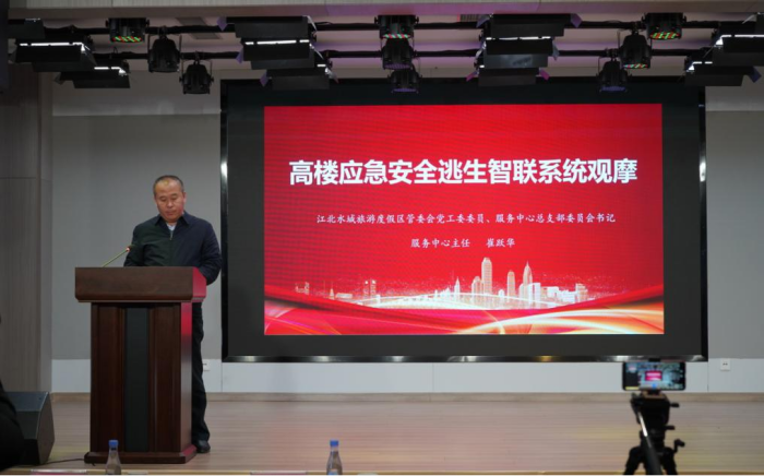 江北水城旅游度假区管委会党委委员、服务中心主任崔跃华指出:“高楼应急安全逃生智联系统”项目的推进是一项事关人民群众生命安全大事的民生工程。是我们坚持以人民为中心,践行安全发展理念,打造安全、宜居城市的集中体现。他表示:安全是城市的生命。打造高楼应急安全逃生智联系统示范区、示范城市,将成为我们创新城市发展方式、提升城市安全治理能力的又一新亮点。