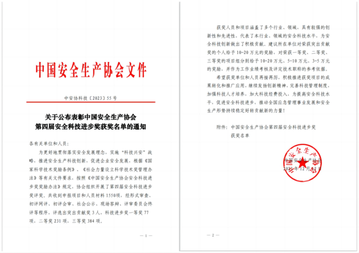 “中国安全生产协会第四届安全科技进步奖”!