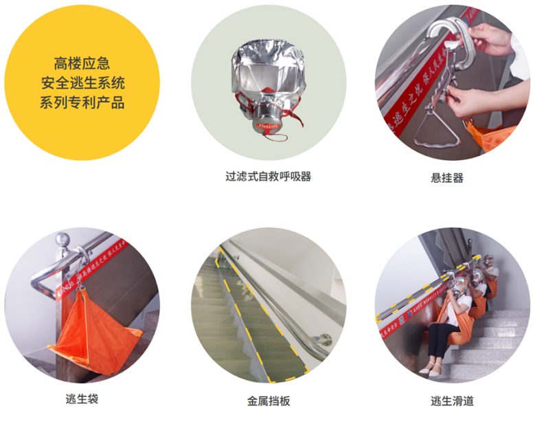 推荐产品:咸润实业新一代“高楼应急安全逃生系统”配备更为安全的过滤式自救呼吸器,其耐热防热辐射,视野开阔,气密性好,能很好地避免烟雾的吸入。