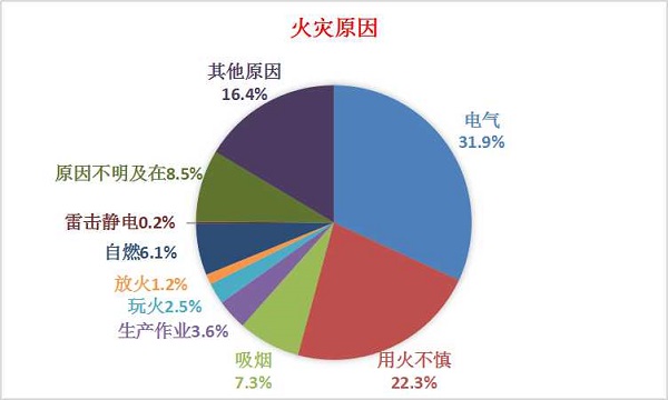 从火灾调查情况看,因电气引发的占31.9%,尤其是57.8%的较大火灾也系电气引起;其次,因用火不慎引发的占22.3%;其余原因中,吸烟占7.3%、生产作业占3.6%、玩火占2.5%,放火占1.2%、自燃占6.1%,雷击静电占0.2%,原因不明及在查的占8.5%,其他原因占16.4%。
