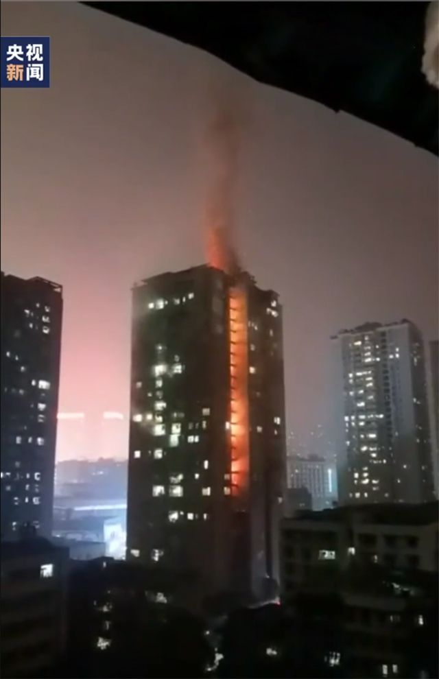 现场画面显示,火势异常凶猛,明火很快贯穿着火点以上楼层,高楼瞬间变成了一个“烟囱”,不断还有小火星从顶楼往下掉,看起来触目惊心。初步了解,起火原因是中间楼层的雨棚着火引发火灾,具体情况正在进一步的调查中。