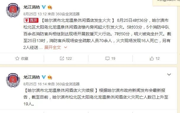 25日凌晨,哈尔滨市消防支队指挥中心接到报警,称松北区太阳岛风景区北龙温泉休闲酒店发生火灾。指挥中心随即调派太阳岛、道外、利民等消防中队及大吨位水罐车到场处置。5时03分,太阳岛中队率先到场,消防部门共计疏散人员80余人,搜救被困人员20余人。7时50分火灾全部扑灭,经多次搜救排査,现场发现死亡人员18人,一名患者在医院救治无效后死亡。