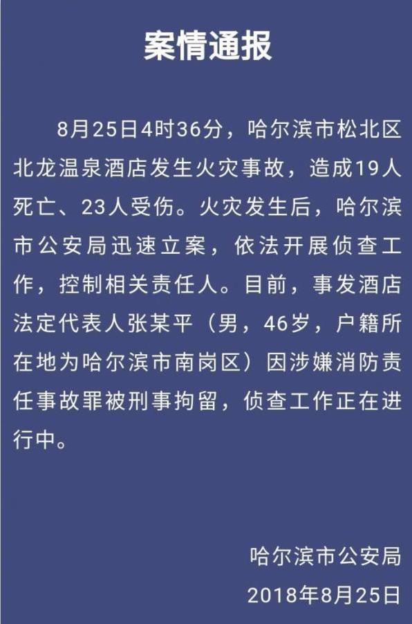 火灾发生后,哈尔滨市公安局迅速立案,依法开展侦查工作,控制相关责任人。目前,事发酒店法定代表人张某平因涉嫌消防责任事故罪被刑事拘留,侦查工作正在进行中。