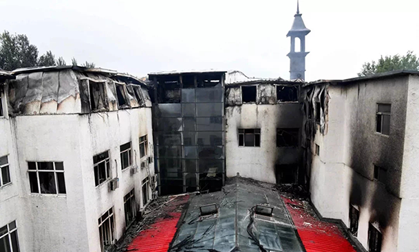 在火灾现场可以看到,北龙酒店呈“口”字型,除主楼外,配楼也有明显过火痕迹,4层楼顶的铁皮已经变形。